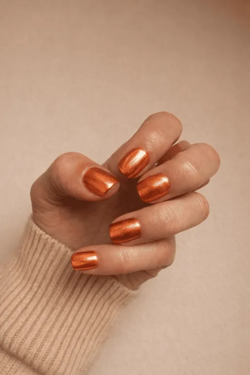 Copper glow nails catch the light with a warm, metallic radiance like sunset copper.