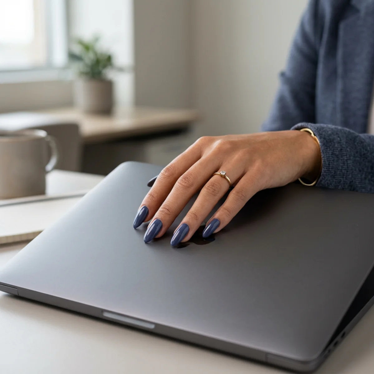 A sophisticated dusty blue with gray undertones. This professional shade is polished and chic, making it a perfect office-to-evening color.
